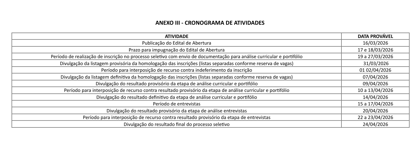 O processo segue critérios de cotas para pessoas negras, com deficiência, travestis e transexuais, e indígenas, conforme regulamentação institucional.