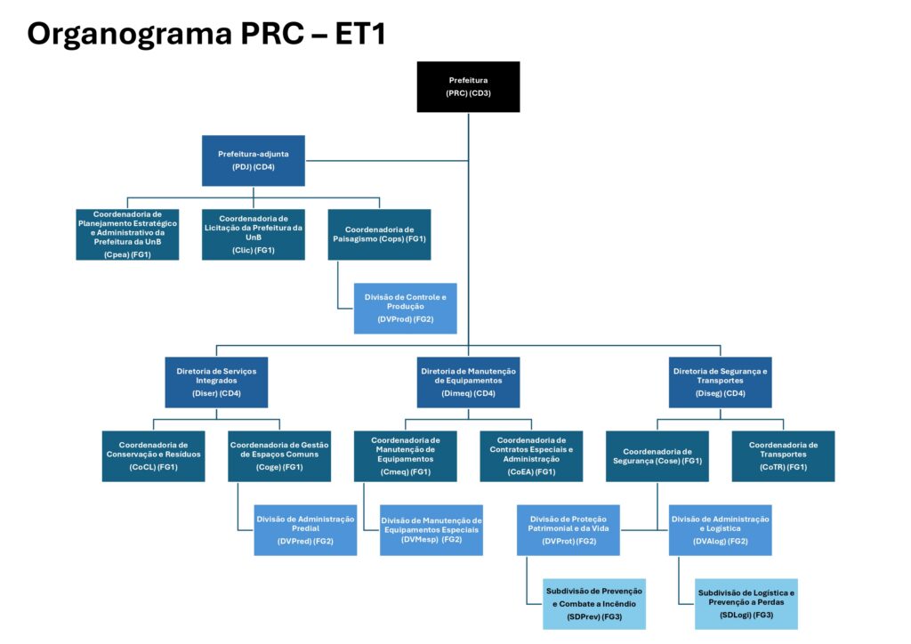 Define a estrutura organizacional da Prefeitura da Universidade de Brasília (PRC).