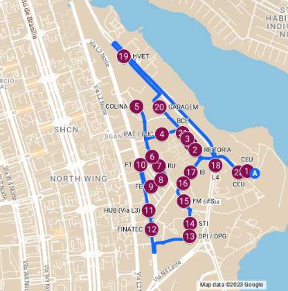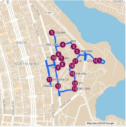 Destaca-se  que o transporte intracampus tem início a cada uma hora, em frente a Casa do Estudante (CEU), e que o percurso completo tem o tempo aproximado de 42 minutos. Clique nas imagens para visualização detalhada dos mapas.